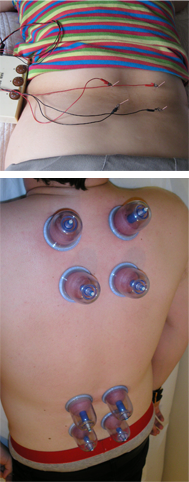Cupping: A therapy in which a jar is placed on the skin surface to cause local congestion, through the removal of the air in the jar. This method promotes the free flow of Qi and blood in the channels, diminishes swellings and pains, an dispels cold and dampness.